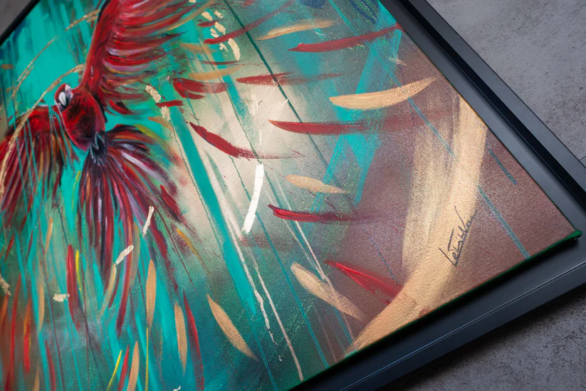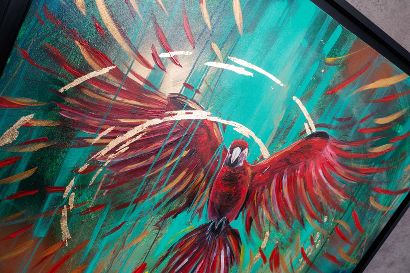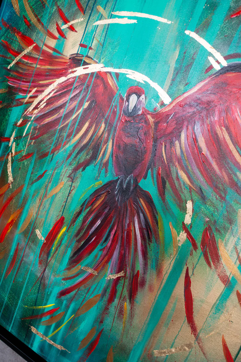 Chaque coup de pinceau que j’ai appliqué avec passion dans cette création unique porte en lui un message profond que cet oiseau exotique souhaite partager avec vous.