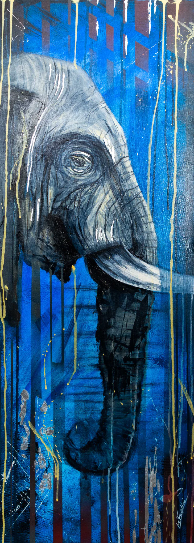 Chaque coup de pinceau que j’ai appliqué avec passion dans cette création unique porte en lui un message profond que cet animal emblématique souhaite partager avec vous. Lorsque j’ai peint ce profil d’éléphant sur un fond bleu intense, j’ai été inspiré par sa majestuosité et sa puissance tranquille. Cet animal incarne une grâce imposante et une sagesse intemporelle, et c’est cette émotion que j’ai cherché à capturer dans cette œuvre.
