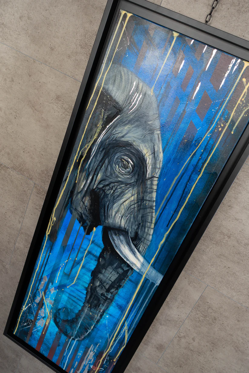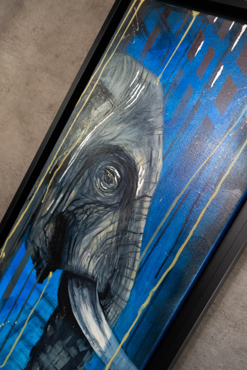 Laissez-vous emporter par l’atmosphère envoûtante de ce tableau moderne, où la présence majestueuse de l’éléphant se marie harmonieusement avec le fond bleu intense. Offrez-vous dès maintenant cette pièce d’art exceptionnelle et laissez-vous inspirer par la force tranquille et l’élégance captivante de cet animal emblématique.